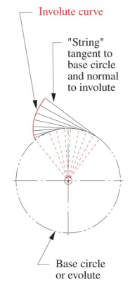 Fundamental law of gearing을 만족하는 대표적인 이 형상은 involute shape이다. Involute curve는 아래 사진과 같이 줄을 쭉 당겼을 때 만들어지는 곡선이다.