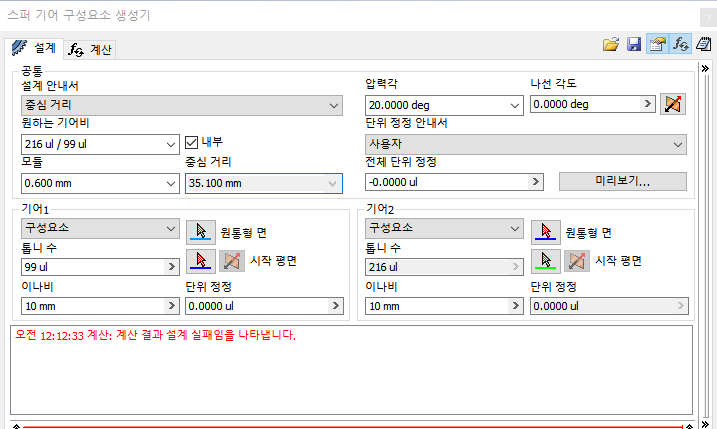 2) 설계 안내서에서 자동으로 계산하고 싶은 값 선택(중심 거리로 하는게 편한듯)