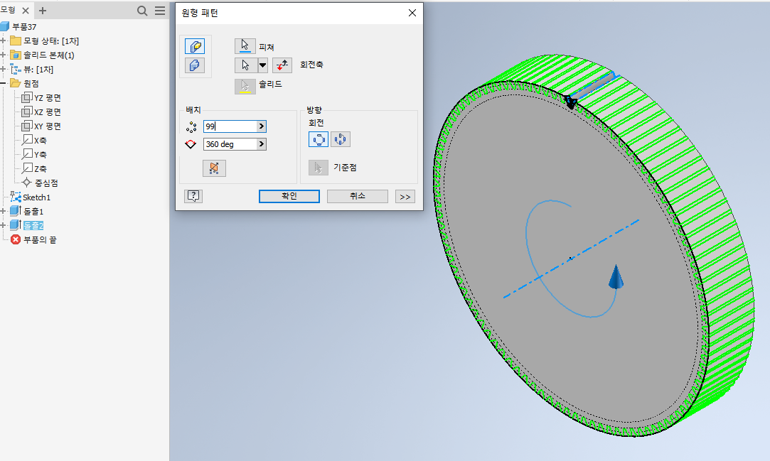 13) “원형” 기능을 이용하여 돌출을 회전축에 대해 잇수만큼 반복해준다.