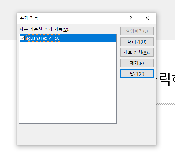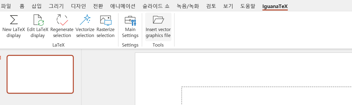 완료하면 상단 리본에 IguanaTex 메뉴가 생긴다.