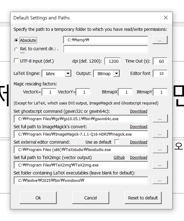한글 사용이 필요하다면 UTF-8 Input에 체크해주고 \usepackage{kotex} 후 사용.