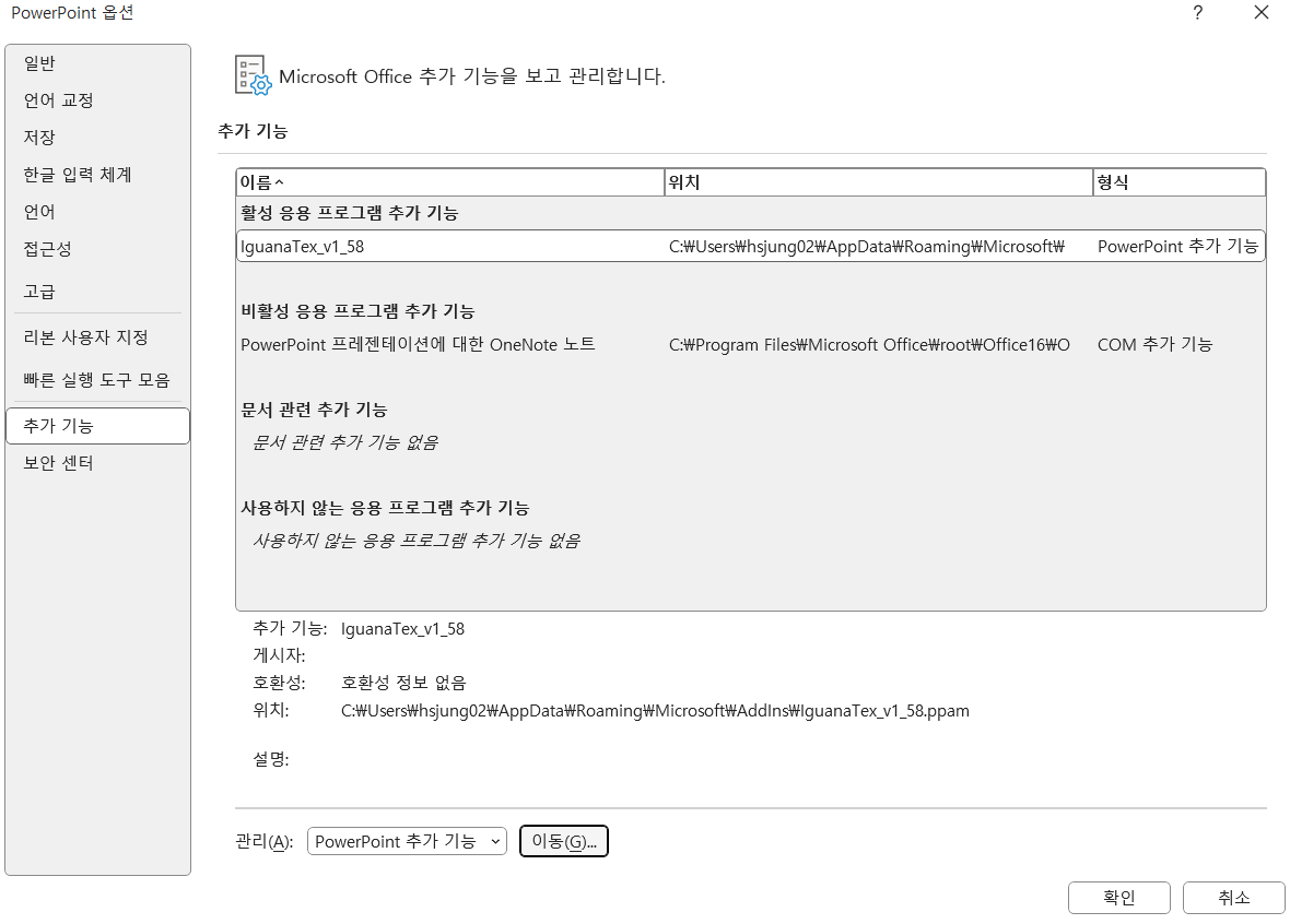 파일 > 옵션 > 추가 기능 > 관리 메뉴에서 PowerPoint 추가 기능 선택 및 이동